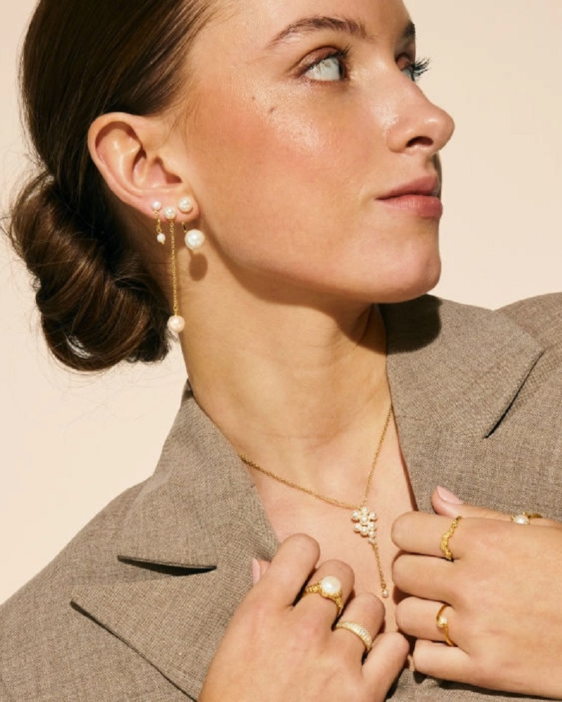 Perlerne fortsætter ned i den karakteristiske Y-form og afsluttes med en diskret, hængende detalje, der tilfører bevægelse og et elegant spil.