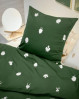 Meget smukt sengetøj med en rolig mørkegrøn grundfarve som er prydet med de fineste hvide Designikoner jævnt fordelt på sengetøjet i et roligt og harmonisk mønster.