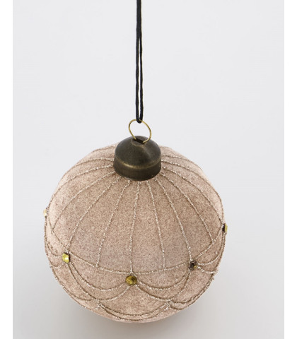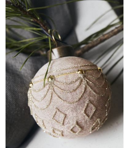 De flotte julekugler har en fløjlsblød sand-farvet overflade, og er smukt pyntet med et fint glimmer mønster.